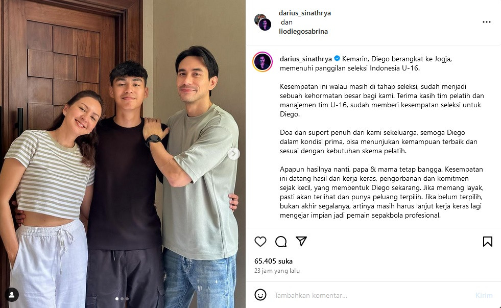 Kabar membanggakan dibagikan oleh presenter kondang Darius Sinathrya. Melalui unggahan di Instagram miliknya, suami Donna Agnesia ini mengumumkan jika putranya yang bernama Diego Andres Sinathrya memenuhi panggilan seleksi Timnas Indonesia U-16.