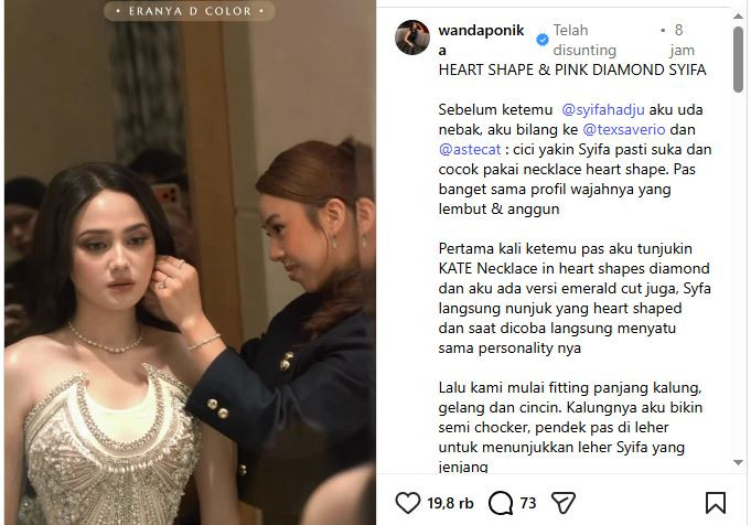 "Dari awal waktu kita diskusi beberapa pilihan, aku sudah feeling kalau syifahadju pasti suka sama Kate Necklace in heart shape diamond. Ini adalah one of a kind necklace by @wandahouseofjewels," tulisnya dalam unggahan tersebut.