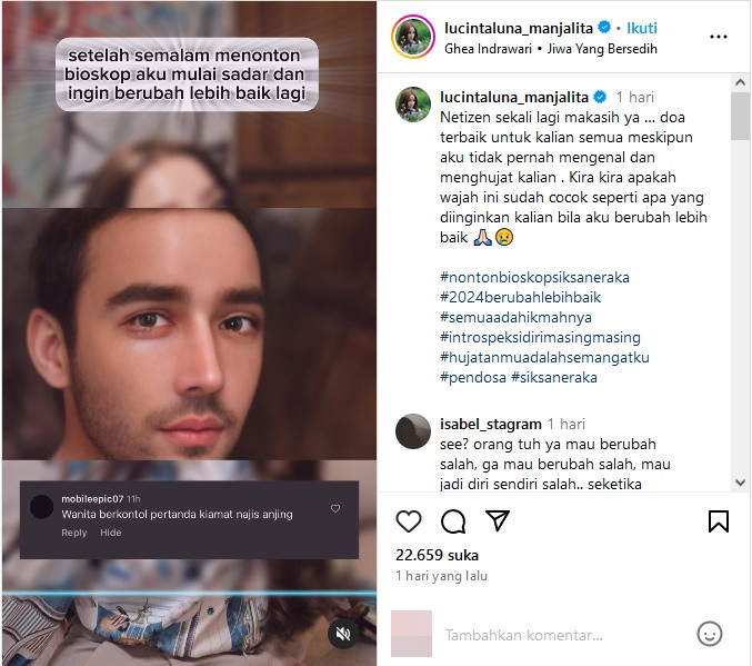 "Sumpah aku enggak tahu lagi, mungkin 2024 aku memang harus berubah. Karena, banyak adegan yang sangat seram yang bikin aku kayak enggak kuat aku nontonnya," ujar Lucinta Luna, dalam video yang diunggah di Instagram