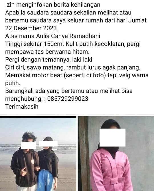 "Saudara saya keluar rumah dari hari Jum'at 22 Desember 2023. Atas nama Aulia Cahya Ramadhani. Tinggi sekitar 150cm. kulit putih kecoklatan, pergi membawa tas berwarna hitam. Pergi dengan temannya laki laki Ciri ciri, sawo matang, rambut lurus agak panjang. Memakai motor beat (seperti di foto) tapi velg warna putih" bunyi pesan tersebut.