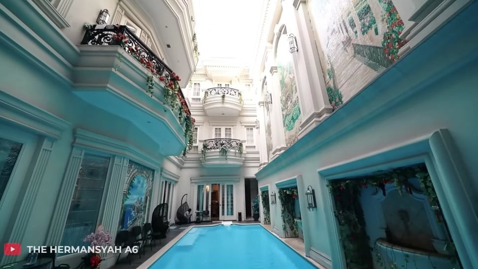 2. Kolam renang terletak di bagian tengah dan dikelilingi dengan bangunan rumah. Kolam renang rumah Helena Lim terlihat seperti kolam renang yang ada di hotel mewah.