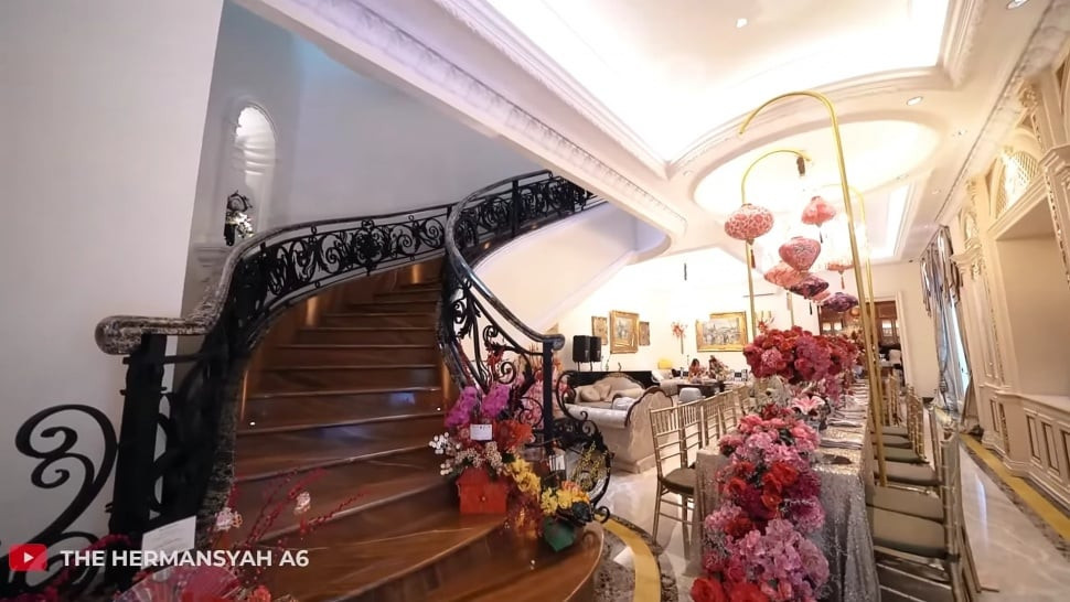 Di bawah tangga meliuk warna coklat, terdapat ruang makan yang dilengkapi dengan meja panjang beserta kursinya. Meja makan juga dengan bunga-bunga berwarna merah dan pink serta lampion mini.