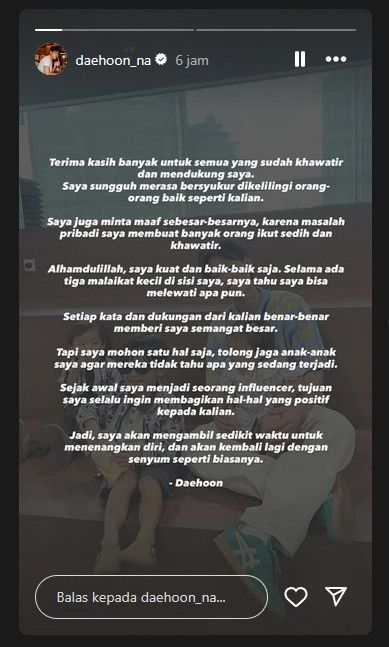 "Terima kasih banyak untuk semua yang khawatir dan mendukung saya. Saya sungguh merasa bersyukur dikelilingi orang-orang seperti kalian. Saya juga minta maaf sebesar-besarnya, karena masalah pribadi saya membuat orang ikut sedih dan khawatir, tulis Daehoon.